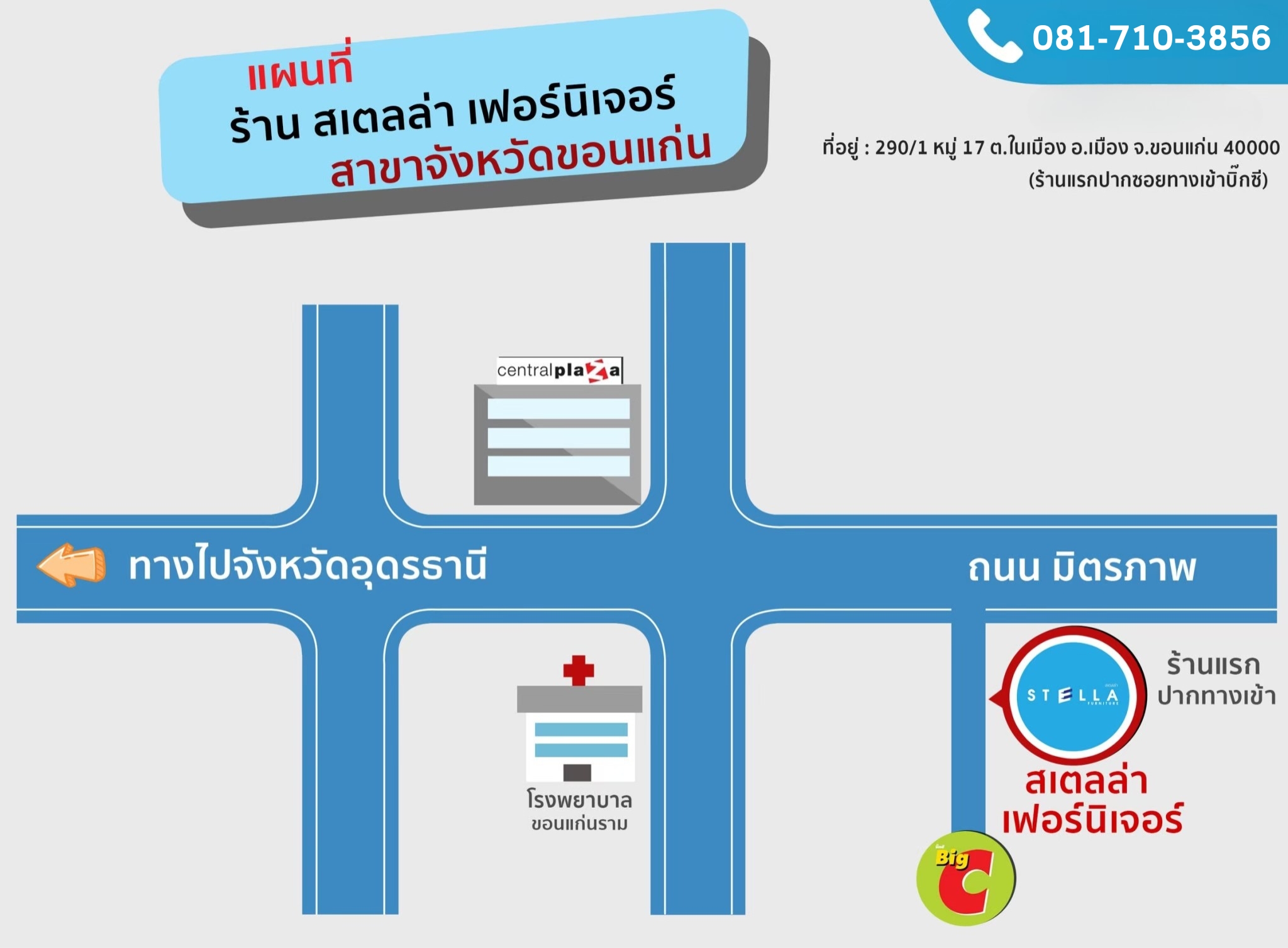 สเตลล่าเฟอร์นิเจอร์ สาขาบิ๊ก ซีขอนแก่น ที่อยู่ร้าน : ที่อยู่ร้าน : 290/1 หมู่17 ถนนมิตรภาพ ตำบลในเมือง อำเภอเมือง จังหวัดขอนแก่น 40000