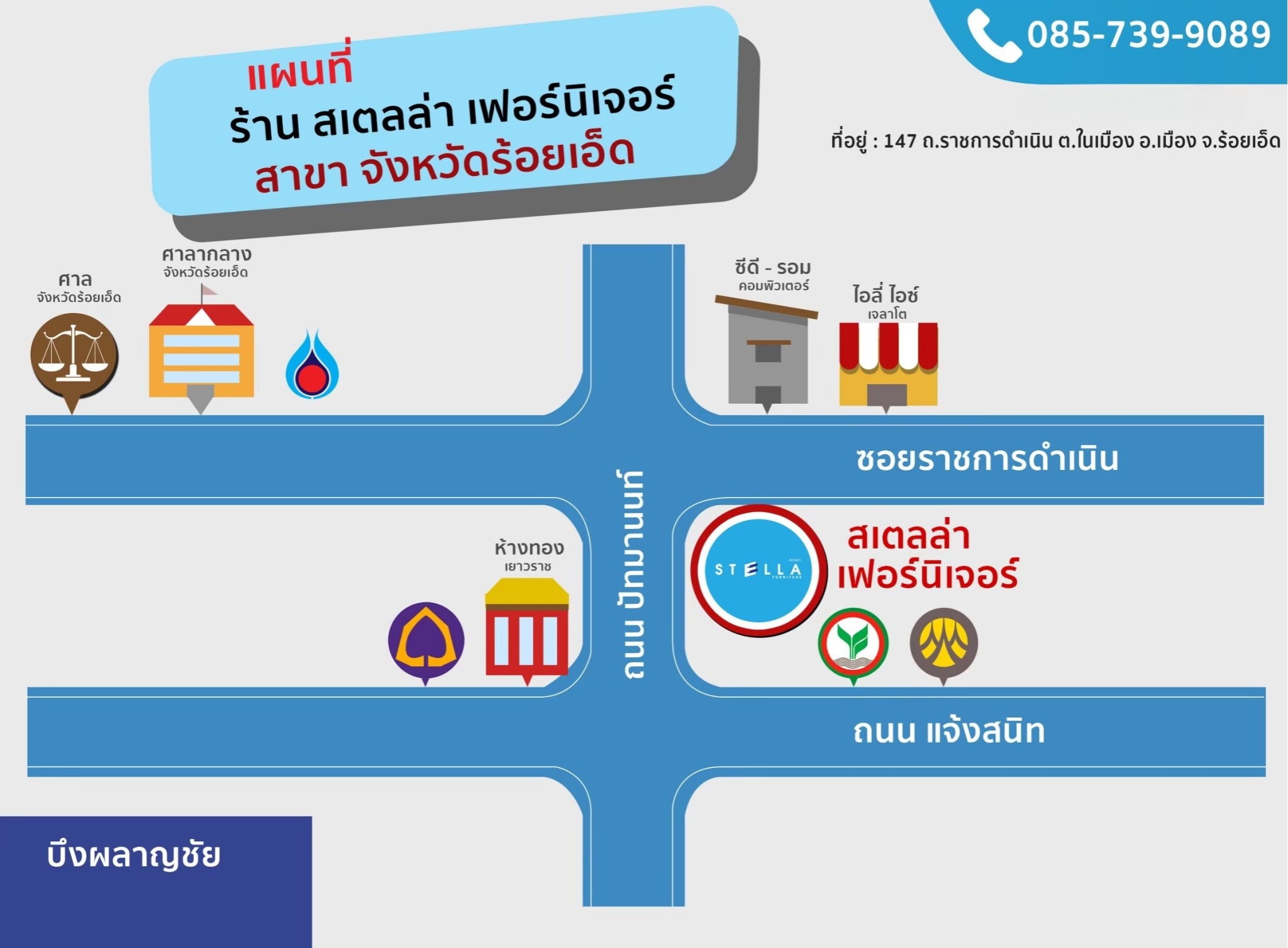 ร้านสเตลล่าเฟอร์นิเจอร์ สาขา ร้อยเอ็ด ที่อยู่ร้าน : ร้านตั้งอยู่ข้างๆโกลบอลเฮ้าส์ร้อยเอ็ด ถนนเลียงเมือง
