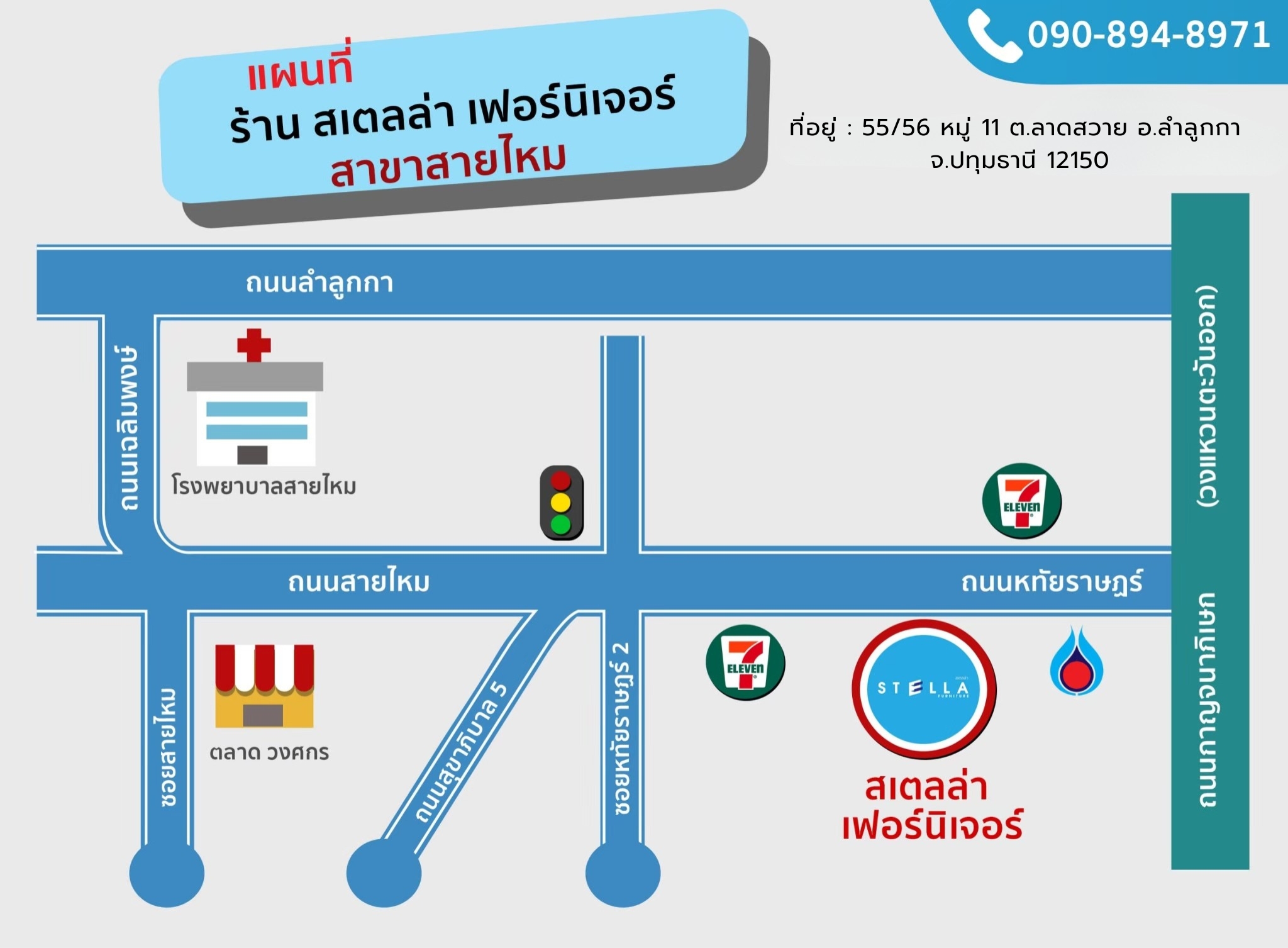 ร้านสเตลล่าเฟอร์นิเจอร์ สาขา สายไหม ที่อยู่ร้าน : 55 56 ถ. หทัยราษฎร์ ตำบล ลาดสวาย อำเภอลำลูกกา ปทุมธานี 12150