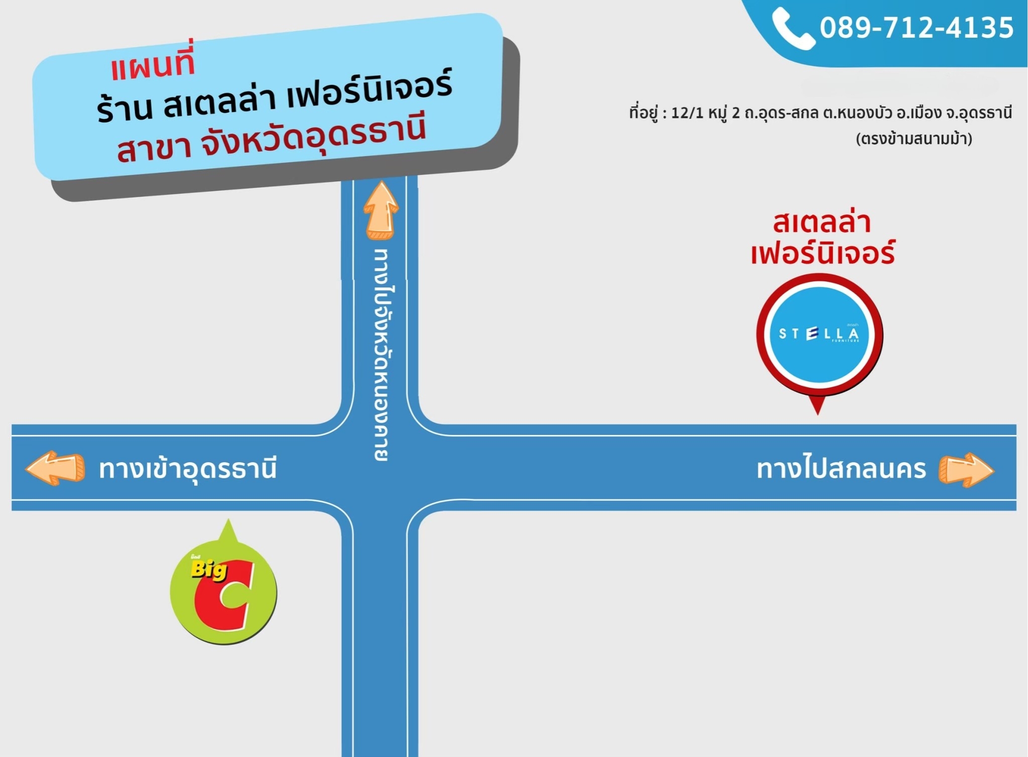 ร้านสเตลล่าเฟอร์นิเจอร์ สาขา อุดรธานี ที่อยู่ร้าน : บ้านเลขที่ 12/1 ม.2 ถ.อุดร-สกล ต.หนองบัว จ.อุดรธานี 41000
